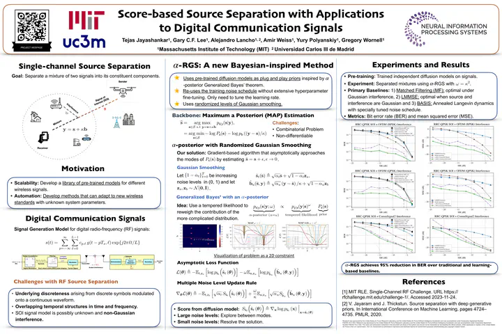Our latest paper on score-based methods for source separation with applications to digital communication signals with underlying discrete structures was accepted for a poster presentation at NeurIPS 2023. Please refer the abstract pasted below and to the links above for more information.