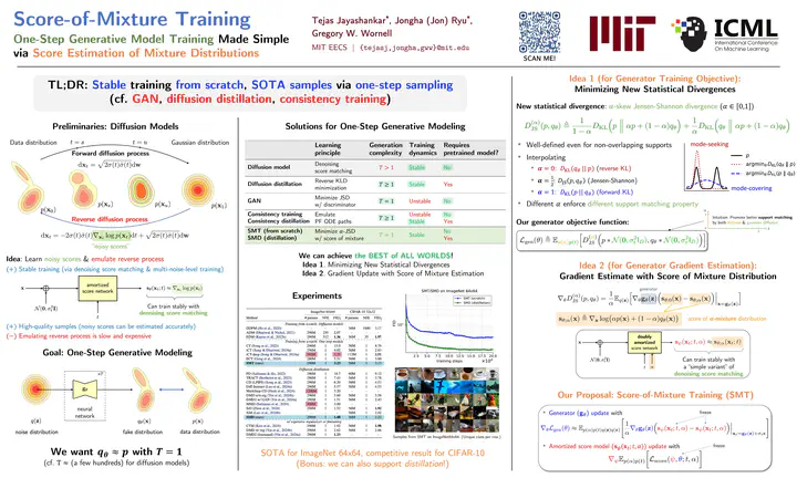Our new paper “Score-of-Mixture Training: One-Step Generative Model Training Made Simple via Score Estimation of Mixture Distributions” has been accepted as a Spotlight Poster (top 2.6%) at the 42nd International Conference on Machine Learning (ICML 2025). This is joint work with Jongha (Jon) Ryu and Gregory W. Wornell. Please refer to the links above for more information. In this work we propose a new distribution matching framework grounded in minimizing the skewed Jensen-Shannon divergence between interpolated distributions that we show allows for a simple framework for training generative models from scratch (without expensive pre-training and distillation), with minimal architectural design changes and outperforms existing methods for image generative modeling from scratch.